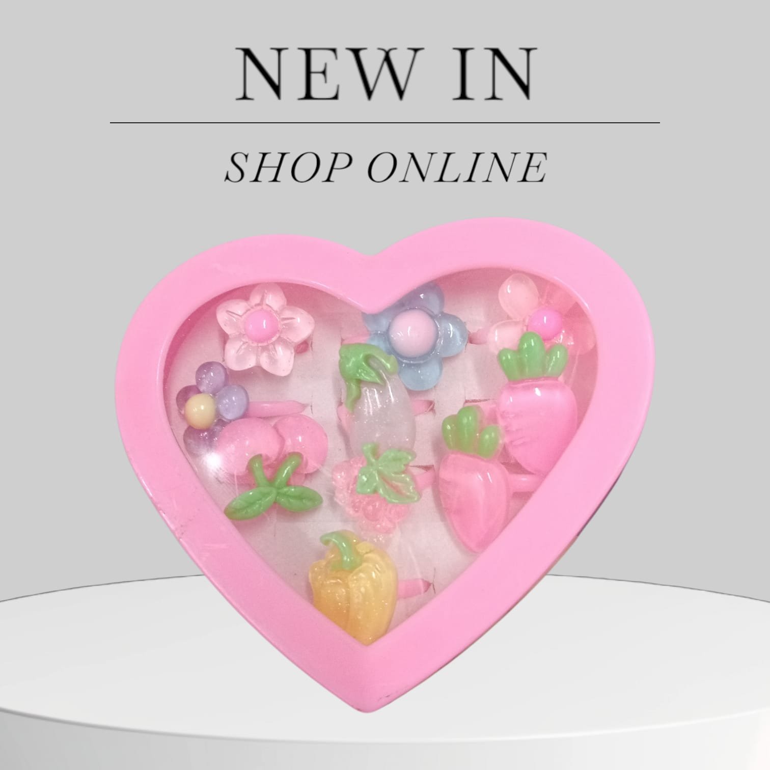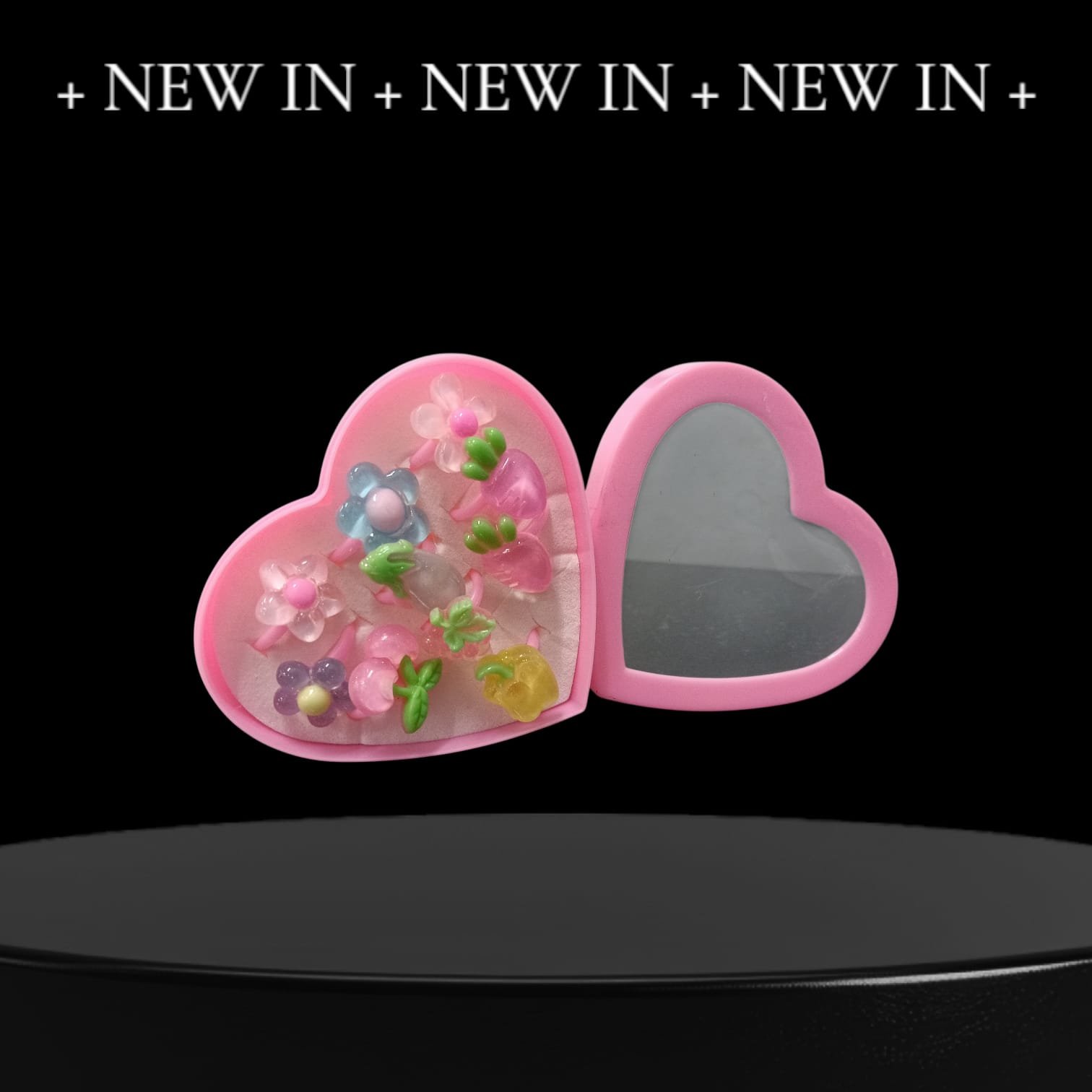 10 Multishaped rings in different colors and shapes. Packed in a cute and attractive heart shaped box loved by girls.