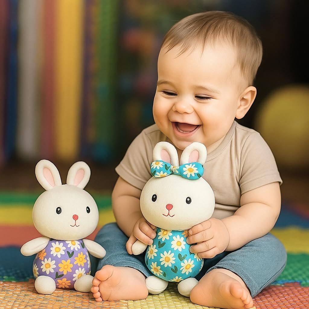 • Adorable Floral Outfit: Each bunny wears a unique, brightly colored floral dress with a matching bow on its ears.