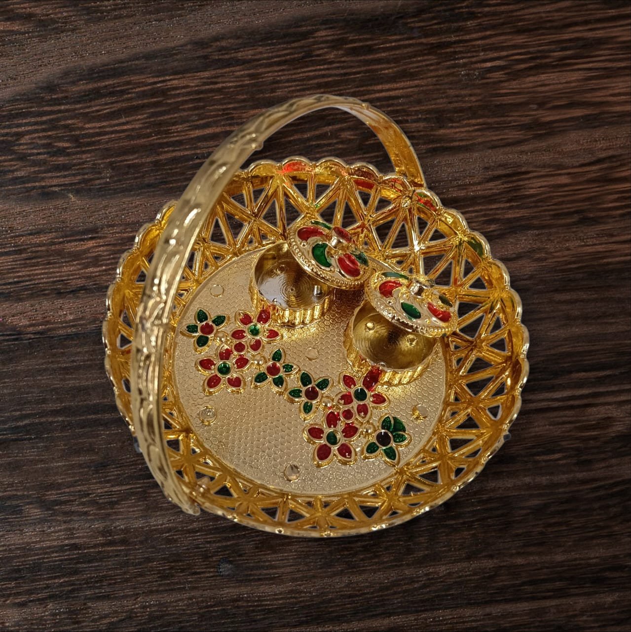 Description: Golden Colour Acrylic material with metal finish Beautiful Fine Meenakari Work, Festive Fancy Design koiri return gifts combo set. The design is elegant and delicate with the perfect golden shine. The red and green colour work enhances the look of the item which makes it Puja worthy