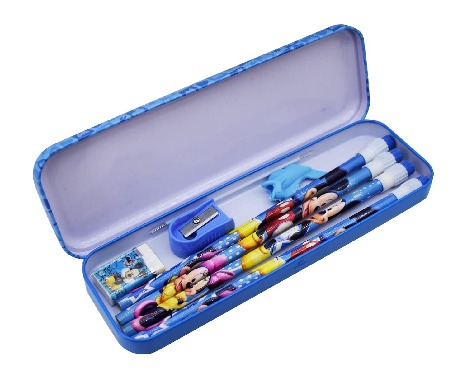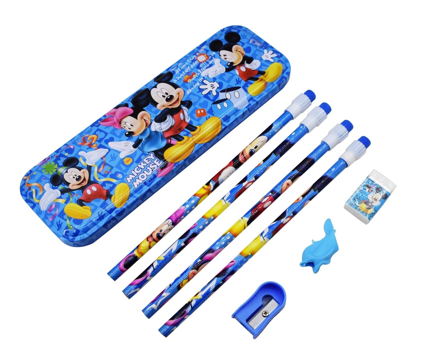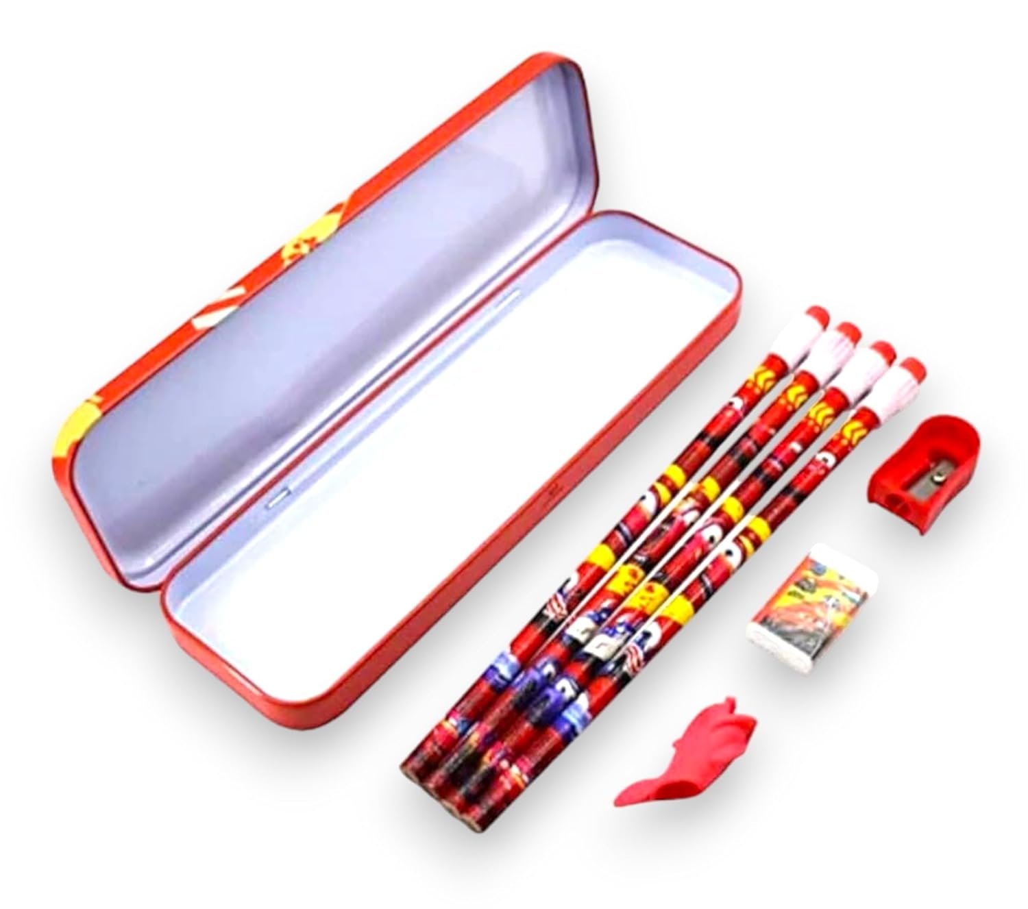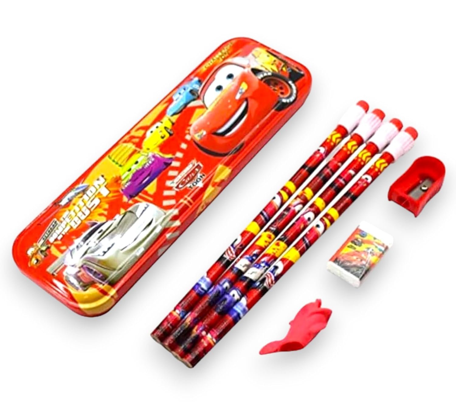 8-in-1 Stationery kit set for kids | 1 Pencil Box 4 Pencils with erasers on top 1 Sharpener 1 Eraser and 1 Pencil Grip (Cars)