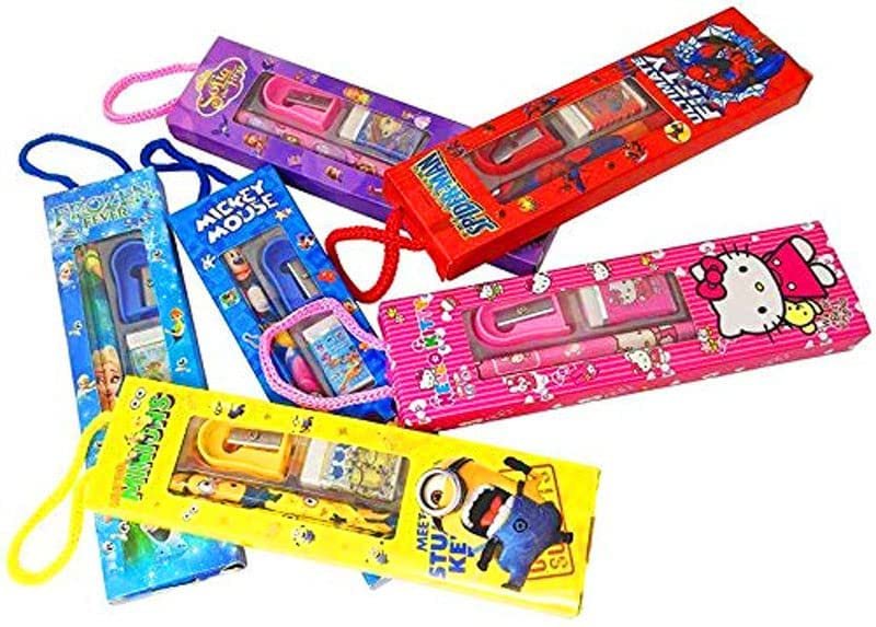 - Each pack contains 1 Fancy Box, 2 pencil, 1 scale, 1 sharpener, 1 eraser
