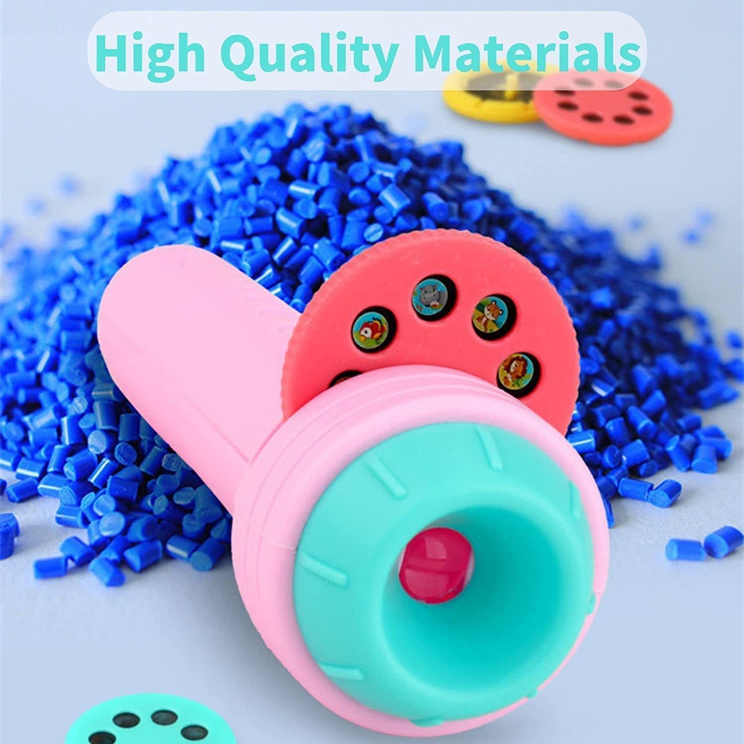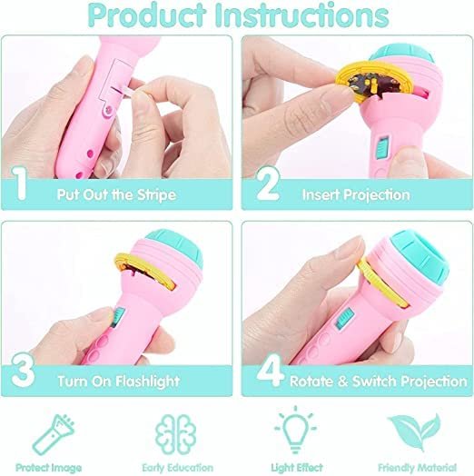 - Kids Projection Light Toy Slide Flashlight Lamp Education Learning Night Light Before Going to Bed – It can be projected on the wall or in the dark. The projection distance is about 50-150 cm. Rotate to adjust the sharpness