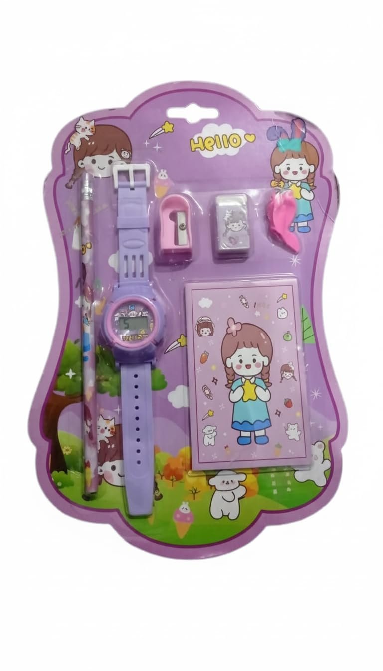 GBT-8454 6 in 1 Stationery Gift Set for Children , Stationery Supplies Bundle with Digital Watch, Sharpener, Eraser, Pencils, Notebook & Cap Return Gift for Kids