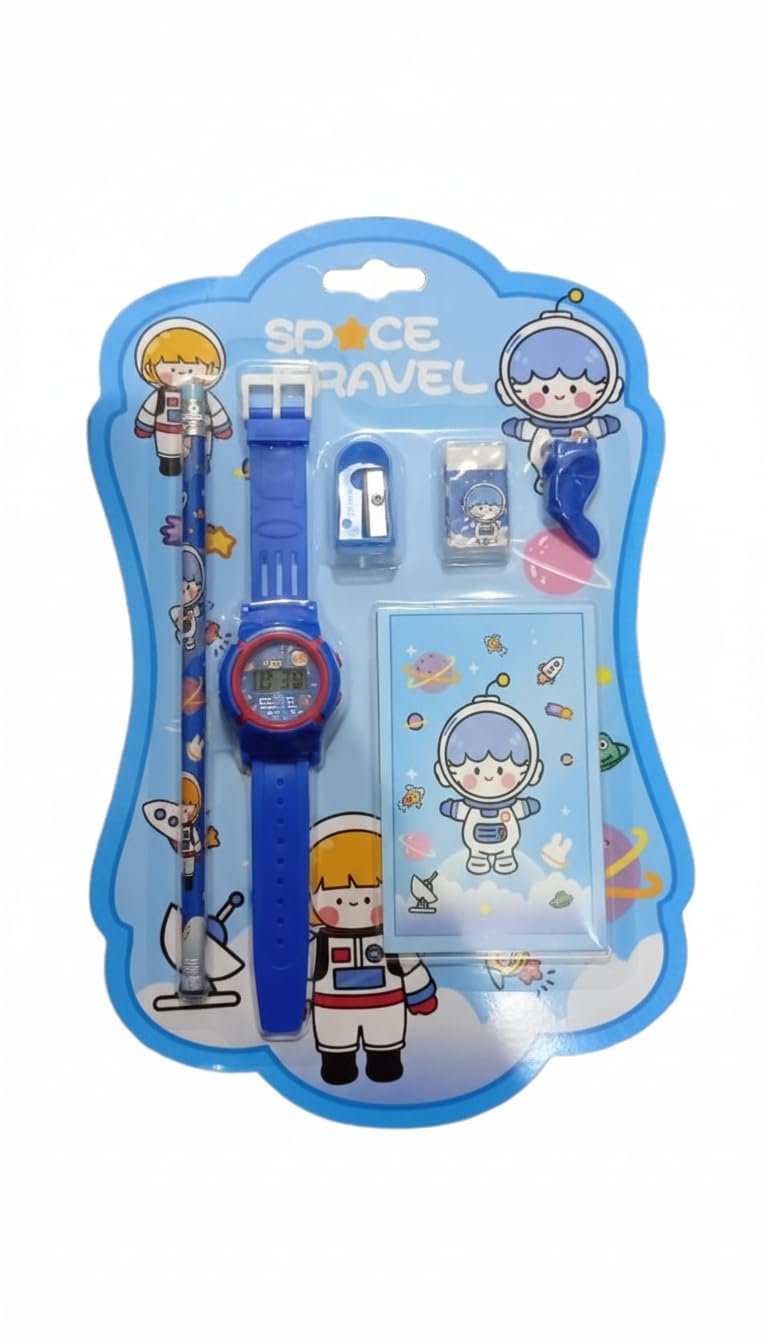 • COMPLETE SET: 5-piece space-themed bundle includes a digital watch, pencil, sharpener, eraser and mini notebook perfect for young explorers