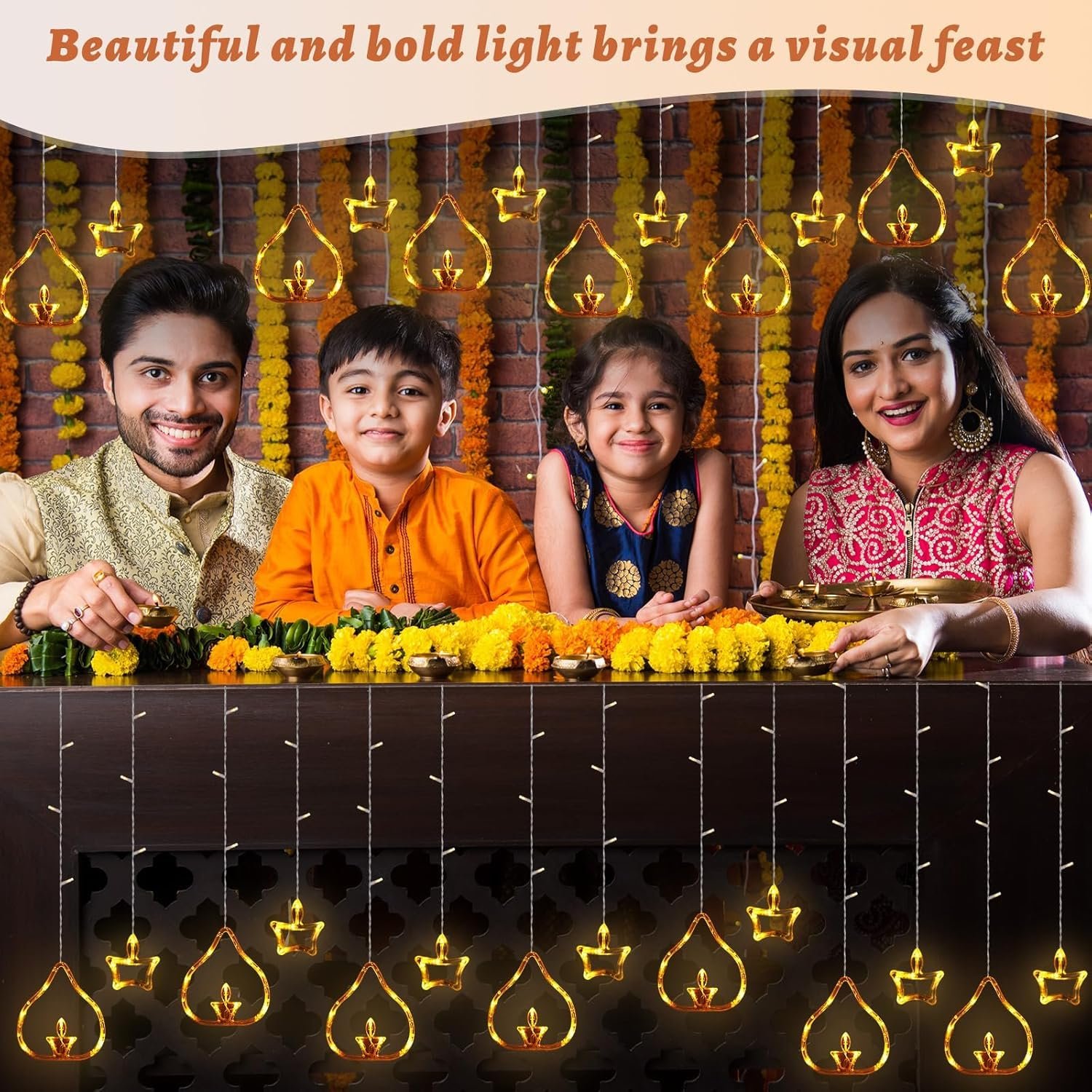 NC-A003-A Diya Lights Diwali String Curtain Lights – Warm White Indoor & Outdoor Lights for Home, Wall, Window, Indian Wedding, Garden, Bedroom, Christmas, Party, and Festive Decor- Corded Electric
